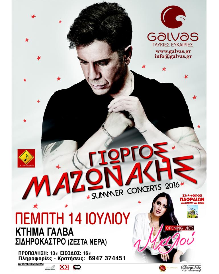 H Eταιρία Γάλβα παρουσιάζει το Γιώργο Μαζωνάκη στο κτήμα Γάλβα στο Σιδηρόκαστρο. Μια μεγάλη συναυλία με τον ανατρεπτικό Γιώργο Μαζωνάκη για πρώτη φορά κοντα μας στο κτημα Γαλβα την Πέμπτη 14 Ιουλίου στις 21.30 .