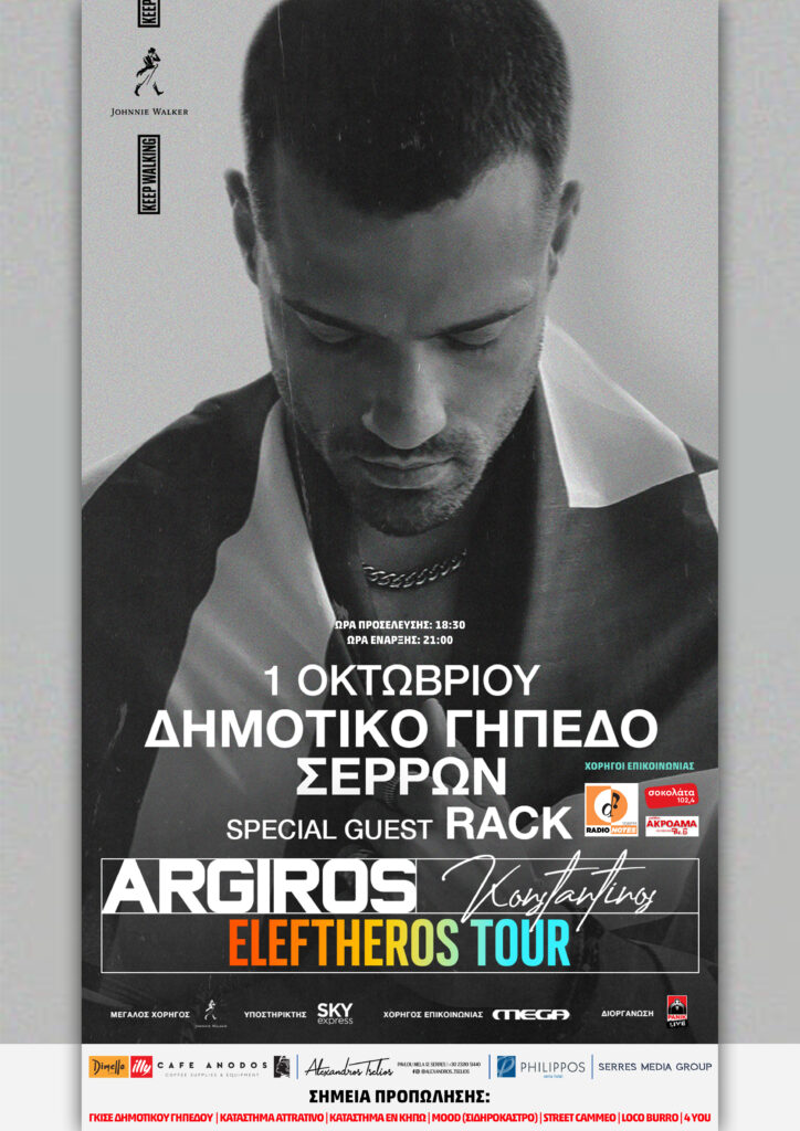 Κωνσταντίνος Αργυρός, ο πιο επιτυχημένος λαϊκός καλλιτέχνης της γενιάς του, ταξιδεύει σε στάδια και μεγάλα θέατρα σε Ελλάδα και Κύπρο με μία μεγάλη μουσική παραγωγή, εξαιρετικής αισθητικής και υψηλών προδιαγραφών, το «Eleftheros Tour», με την υποστήριξη του Johnnie Walker.