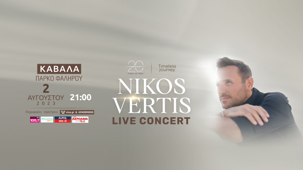 Ο Νίκος Βέρτης, ο καλλιτέχνης που κατάφερε να κάνει τεράστια επιτυχία σε Ελλάδα και εξωτερικό, με πάνω από 300.000 θεατές στις ζωντανές εμφανίσεις του ετησίως, με συναυλίες sold out στα πιο εντυπωσιακά γήπεδα και θέατρα ανά την υφήλιο (Wembley, Kodak Theatre, Mirage Las Vegas, κ.α.), μετά τις δύο συνεχόμενες sold out μαγικές βραδιές στο κατάμεστο Κατράκειο Θέατρο Νίκαιας και στη Ρόδο, έρχεται στην Καβάλα την Τετάρτη 2 Αυγούστου στο Πάρκο Φαλήρου, με μια άκρως επιτυχημένη καλοκαιρινή περιοδεία για τα 20 χρόνια της μουσικής του πορείας.